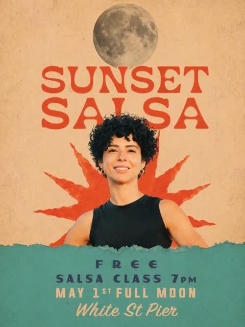 Una clase gratis de salsa en el muelle, bajo la luna llena, con el sol cayendo detrás.